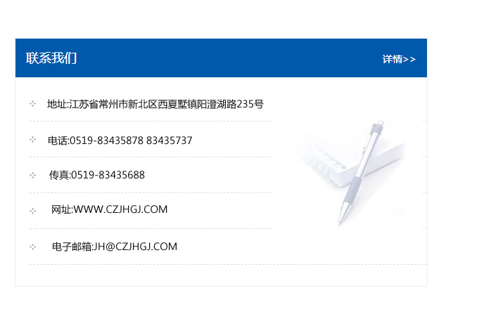 地址:常州市新北區友邦商務大廈1幢16、17層  電話:0519-85101652  傳真:0519-85112595  郵編:213022  網址:www_cz-jiayue_cn.zhadaian.com  郵箱:xiajifengaa@163.com